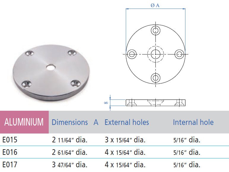 Anchorage 2-15/16" Dia., 4 Holes at 15/64" Dia., internal hole 7/16", Aluminum (E016)